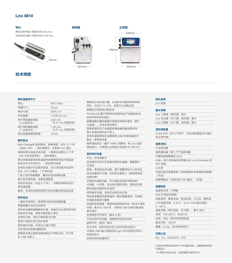 Linx 8810 操作簡單,可滿足多種噴碼需求,具備極高的運行 可靠性和用戶友好性。 快干墨水在產(chǎn)品上實現(xiàn)清晰、準確的噴碼 整體全金屬外殼,8英寸觸摸屏設計,簡單操作 多支持2行噴印,16點陣 配備噴頭自動清潔功能由您掌控 單行噴碼高速度:2.92m/s
